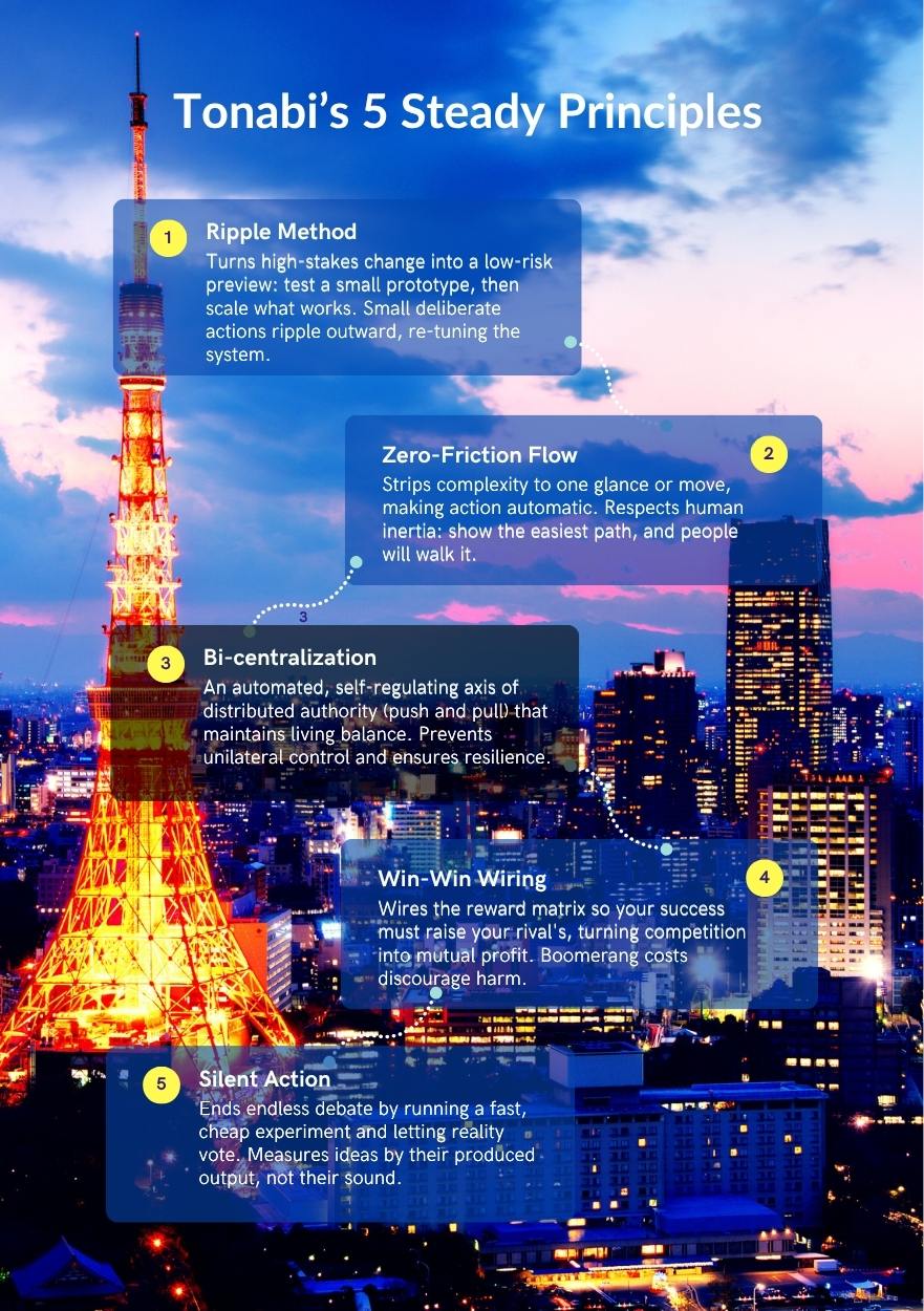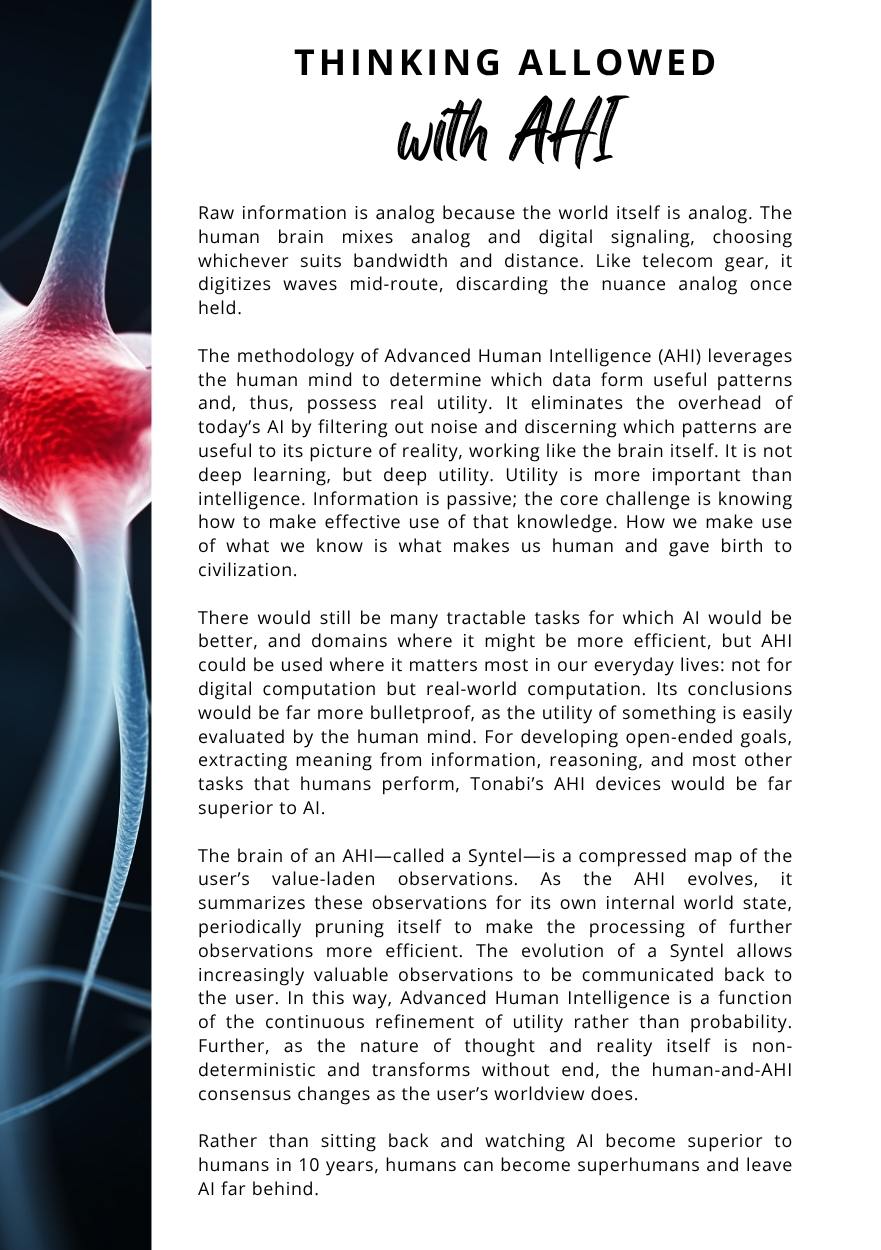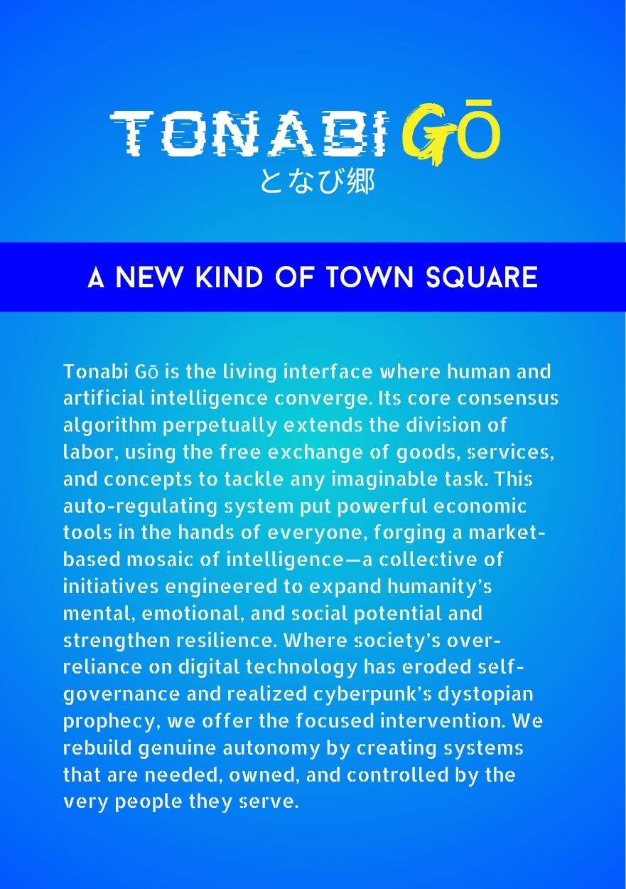 Tonabi’s Advanced Human Intelligence (AHI) technologies and protocols tap collective wisdom to filter noise and surface genuine utility, feeding these insights into Tonabi Gō—a dynamic, collaborative "town square" supporting the collective exchange of knowledge, goods, and services, and the initiation of new ventures. By grounding its consensus in human value, AHI creates an auto-regulating mosaic of intelligence that powerfully expands human potential and builds societal resilience; it exceeds the capability of conventional AI through a focus on real-world utility rather than pure computation.